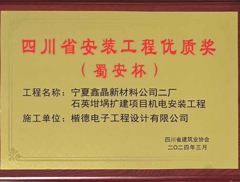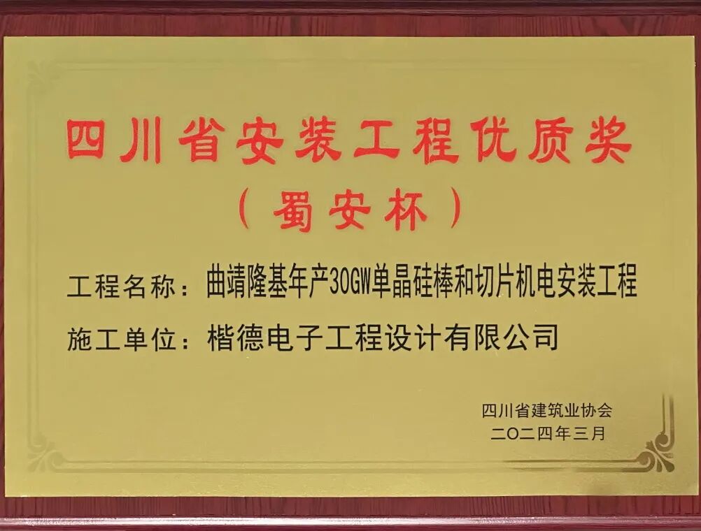 近日,经四川省建筑业协会评审,我司再度荣膺“四川省安装工程优质奖(蜀安杯)”,获奖项目为“曲靖隆基年产30GW单晶硅棒和切片机电安装工程”和“宁夏鑫晶新材料公司二厂石英坩埚扩建项目机电安装工程”。